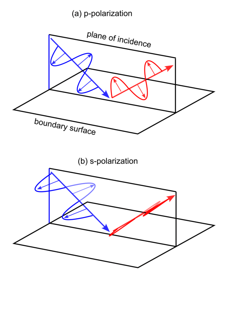 The specific shape of the exponential, that is, how “fast” it decays (refer back to Figures 12 and 13), depends on two factors: the angle of incidence and the polarization. We know what the former is, thanks to Figure 14. Polarization refers to the orientation of the electric field relative to the surface. An illustration such as in Figure 15 makes this easier to grasp. The large arrows show the incident (blue) and reflected (red) directions, and the small arrows the direction of the oscillating electric field. In (a) the field is confined to the plane of incidence, a condition called “p-polarization.” In (b), the field always points in a direction parallel to the boundary surface, making for “s-polarization.” (We could also have something in between, sticking out of incidence plane at some angle, but that is the same as having some combination of each of these two exclusive cases.)