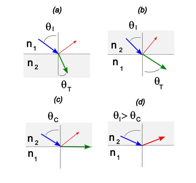 it is 50% slower.) In (a) we have a situation such as incident light (blue) coming from air into water or glass, where some is reflected (red) and the rest transmitted (green). This gives rise to the familiar “bent” shape of immersed objects. In (b) we have the reverse case, and we note that now, the transmitted angle must be larger than the incident one. In (c) we take this idea to the natural conclusion: there must be some incidence angle at which the transmitted light moves off parallel to the boundary: the critical angle,