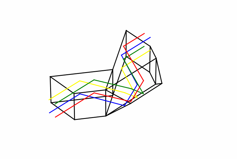 To get both up-down and left-right correction, we can use a Porro prism, as shown in Figure 2. This device uses two glass blocks arranged so as to reflect from four inner surfaces. We use colored rays to show that both a left-right and up-down reversal takes place. By placing such a device between the objective and eyepiece elements in a telescope, we can produce a correctly oriented image. But this geometry also acts to shift the optical path sideways, resulting in the iconic binocular Z-shape. This makes for a bulkier device, and one that is not well-suited for a sealed housing.