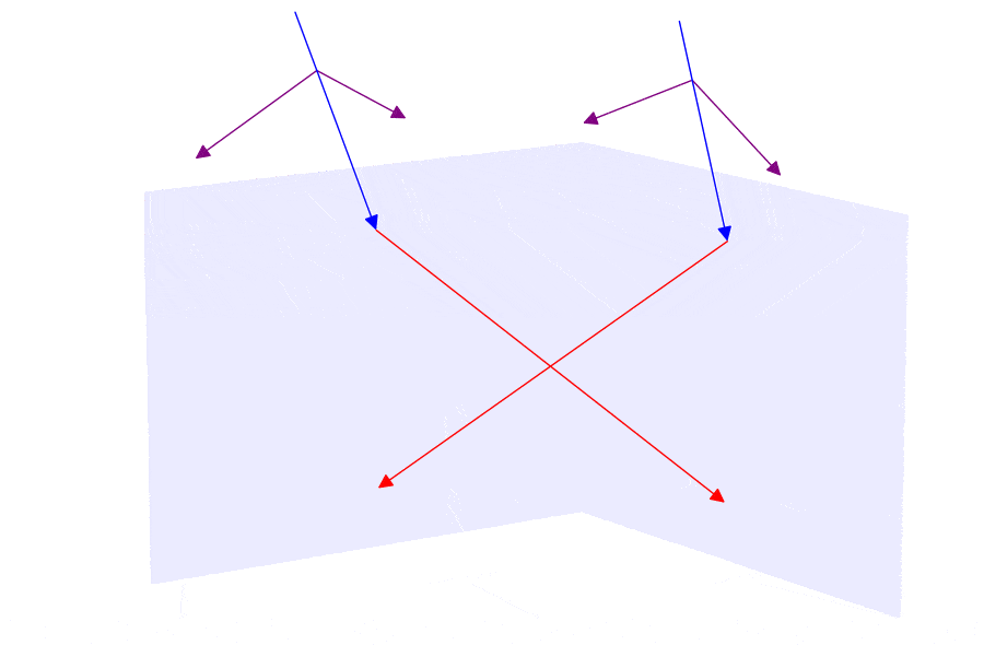 If the prism were standing up straight so that the roof line was perpendicular to the light (imagine rotating the prism in 2(a) clockwise by 45 degrees), then the two rays would clearly strike their respective sides at 45 degree angles, relative to a “normal” or imaginary perpendicular line that sticks out of each face, as in (a). But with the prism orientated as shown, the angle of first incidence (where blue arrows meet red arrows) must be even steeper: it is 60 degrees relative to the normal direction. Upon reflection, the light moves off at 60 degrees, and will then strike the other surface (where red arrows meet green) at the same angle. Meanwhile the other ray takes a route that is a mirror image of this path. Attempting to depict all of this using two dimensional images is not easy, so we will resort to animations that change perspective in order to help visualize what is going on. Figure 3 shows the two interior sides of the roof and the two incoming rays in blue, their first reflections in red, and the exiting rays in green. The total deviation is 90 degrees for both, and they enter parallel and leave parallel. The purple arrows indicate the orientation of the electric field that we are assuming for the incoming light.
