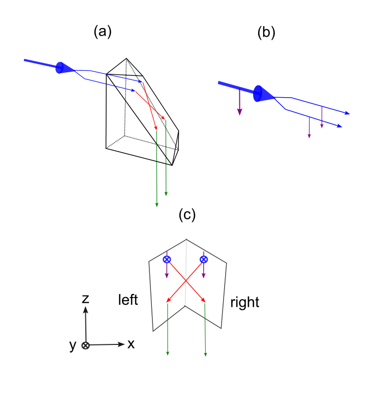 Suppose we start with a laser source, where the beam will feature a single wavelength and will be polarized. We split this into two parallel rays that enter a roof prism oriented such that the roof line makes a 45 degree angle to the light, as shown in Figure 2(a). We will suppose that the light is polarized vertically, with the electric field pointing down as it approaches the surfaces, as shown by the purple arrows in (b). The field is of course oscillating, and pointing up and down as a function of position and time. However it is going to make life much simpler if we simply specify one direction. We will refer to the two sides, and the two beams, as the left and right portions, corresponding to first surface struck from the perspective of the light source, as shown in (c). This point of view will be referred to simply as our reference frame. The vertical direction corresponds to the z-axis, the rightward horizontal direction is the x-axis, and the propagation direction of the initial light is into the screen (or paper), along the y-axis.