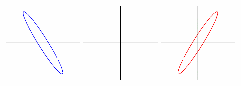 The situation will become more involved when we wish to express the polarization of the incoming light in a reference frame that is not coincident with that of the surface. For example, let’s consider the same situation as in Figures 4 and 6, with linearly polarized light approaching the surfaces of the Amici prism. For those two figures, we always had the initial polarization oriented vertically. In Figure 12 below, we let the orientation of the incoming light vary, shown in the center with the black line, so we can see how the elliptical polarizations produced by the two surfaces respond. They are shown relative to their own native reference frames by the red and blue curves on either side. When the black line is vertical, we are seeing the same situation that was illustrated in Figure 6 above.